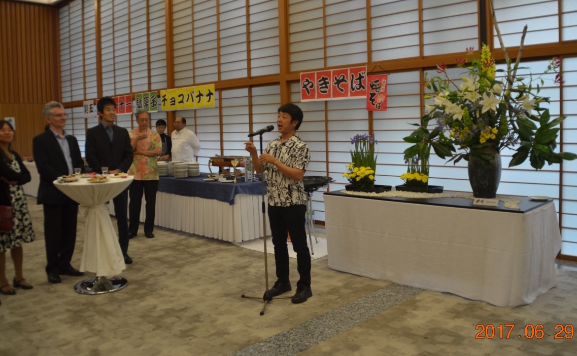 日本人の職員には日本に里帰りした気持ちで楽しんでいただき,他国出身の上司の方には日本の伝統文化,日本酒や和食に親しんでいただくため,七夕や日本の夏祭りのような演出を施し,夏祭りの定番である,たこ焼き,焼きそば,ラムネなどを楽しんでいただきました。参加者も館員も着物や浴衣,法被やアロハシャツなどで参加し,和やかな雰囲気の中,活発な交流を行うことができました。