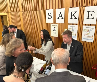 本レセプションでは、当地にて和太鼓文化の紹介・普及・指導に尽力されている礼実太鼓による和太鼓のパフォーマンス披露、日本茶大使の岡本江美子氏及び日本酒ソムリエのマシュー・ゼルヴェゲール氏による日本茶・日本酒紹介を行いました。