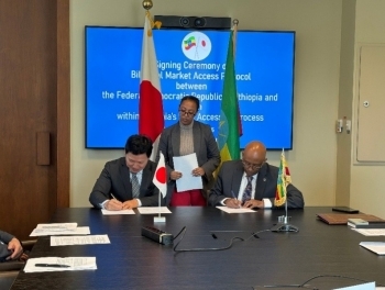 エチオピアのWTO加盟にかかる我が国との二国間市場アクセス交渉の妥結・署名式(令和8年3月2日) 令和8年3月28日 3月4日、ジュネーブのWTOにおいて、エチオピアのWTO加盟に係る二国間交渉妥結を確認する文書署名セレモニーを永井克郎・日本政府代表部大使とTsegab Kebebew Daka・エチオピア常駐代表との間で行いました。 おすすめ情報 イベントメインページに戻る