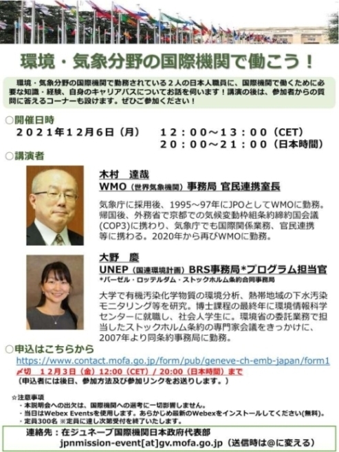 12月6日、当代表部では、オンラインセミナー「環境・気象分野の国際機関で働こう!」を開催し、100名を超える方々にご参加いただきました。